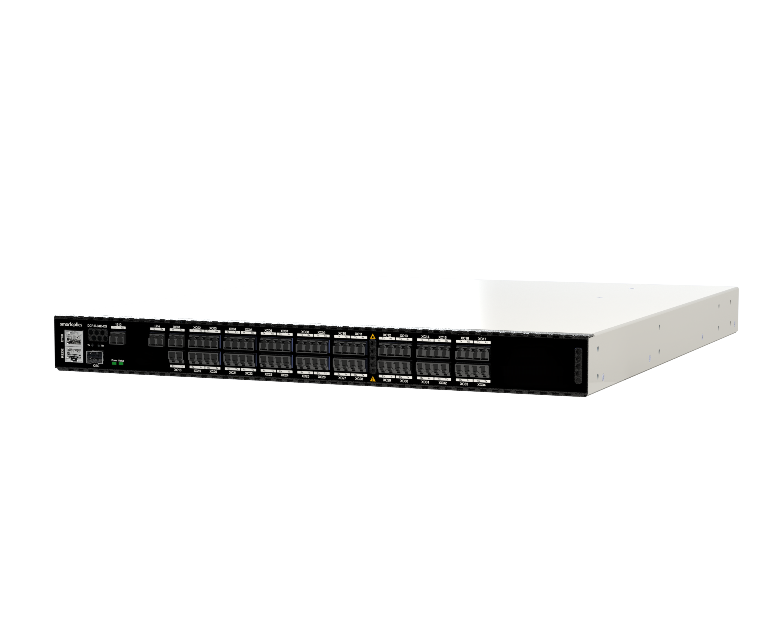Front-facing view of a Smartoptics DCP-34D open line system chassis with multiple high-density optical ports in a 1RU form factor.