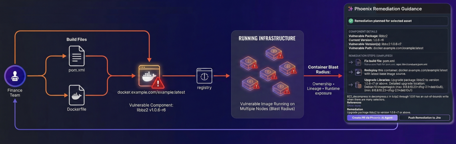 Phoenix Security's Remediation Engine changes the calculus. Before a single fix is proposed, the platform traces each vulnerability through a full lineage graph: from the running container, back through the registry image, to the base image or build file where the issue originates. Only then does the platform generate a remedy — the minimum version increment that closes the most findings, mapped to the correct file, owned by the correct team.
